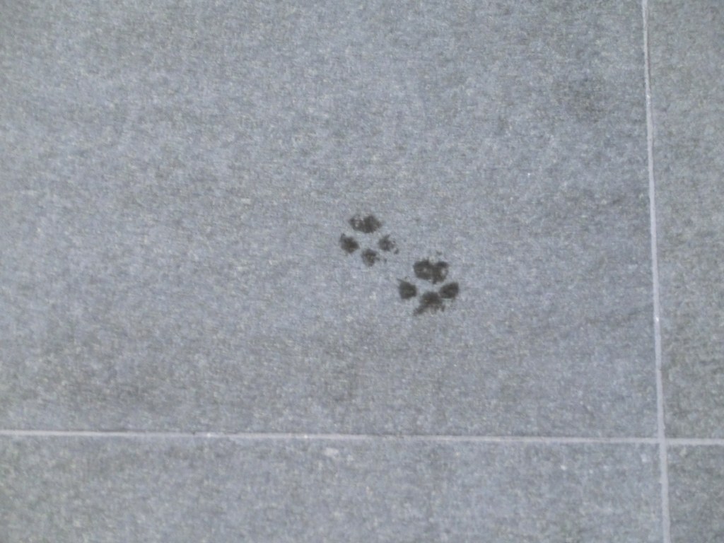 マンションのエントランスに雨に濡れたリリーの足のマークが点々とついていきます。