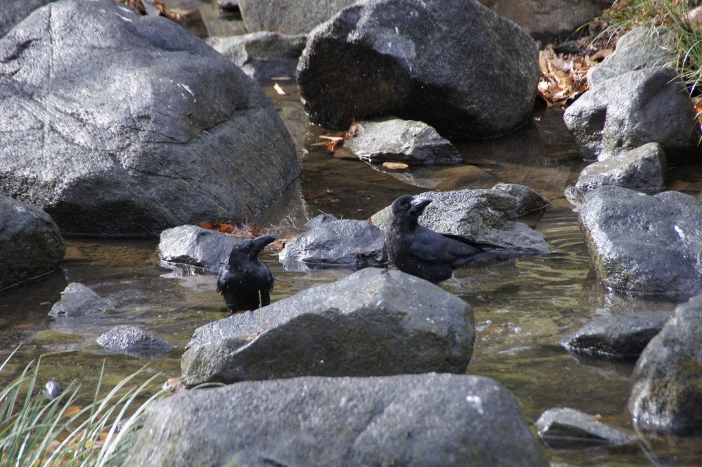 わぁ~ぉ!たくさんのカラスが水浴びしているせせらぎに。。