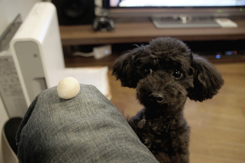 papaのひざの上のおやつが気になるリリー。。
