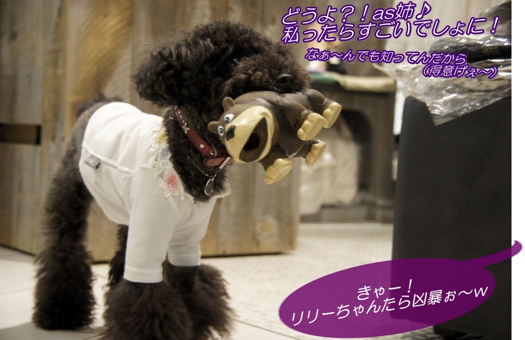 今、このクマ?カバ?ちゃんはリリーのいつものクッション脇に奉納されておりまつでつ(笑)