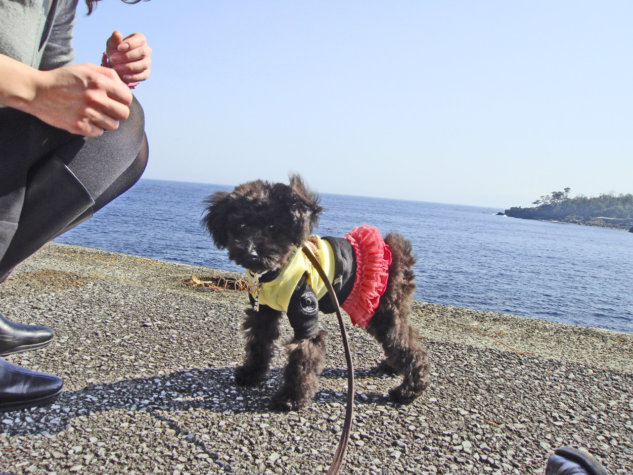 で、一夜明けまして、本日の城ヶ崎は春というよりも初夏の暖かさ。海も穏やかで、リリーに初めての海を店に行くことに。(とは言っても徒歩でも2分程度のところなんですが。)