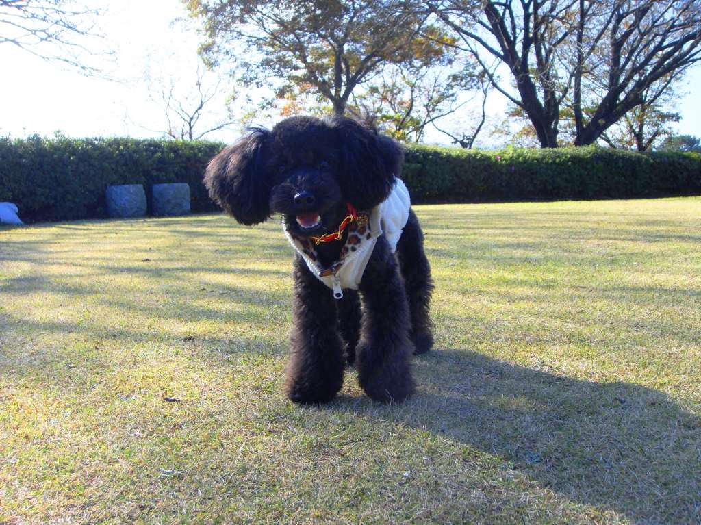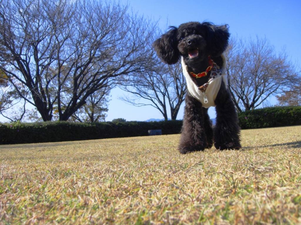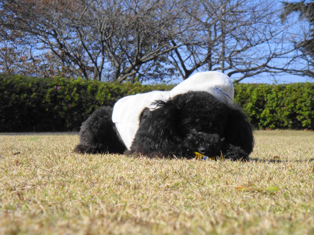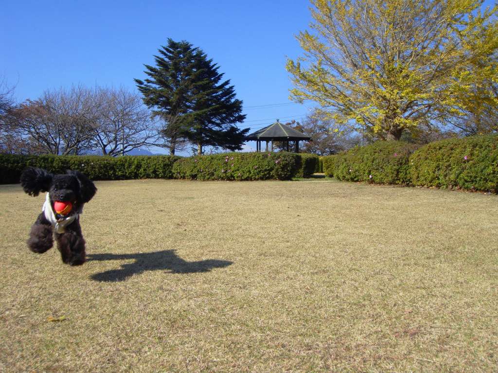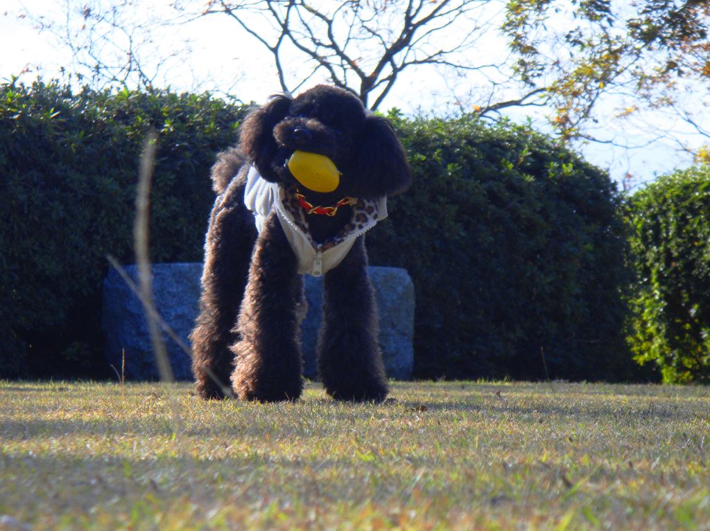 リリーのいつもの居場所はお子様連れでマットを敷いてお昼ごはんを楽しんでいた方が先にいらっしゃっていたので、隣の芝で遊ぶことに。
