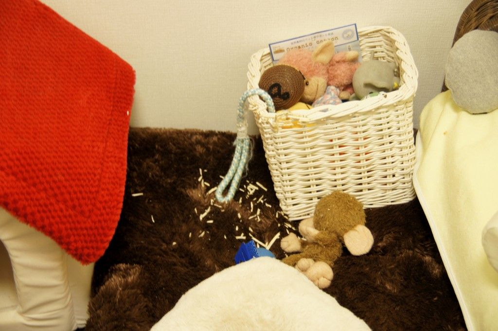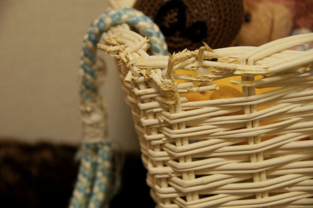 ワンちゃんオモチャ?入れのかごをガジガジして八つ当たりしていた模様。。(呆)