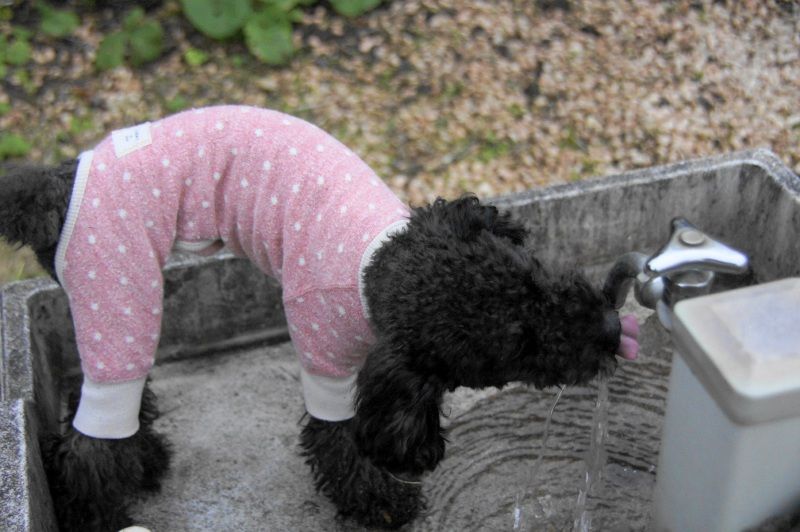 ウォータートレイなんざわざわざ用意できるかい!!ってことで、お庭の水道によじ登っての水分補給。。