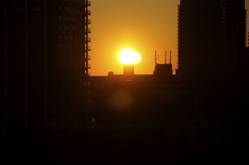 初日の出はベイエリア界隈のビルとビルの間からくっきりと昇りきりました!!