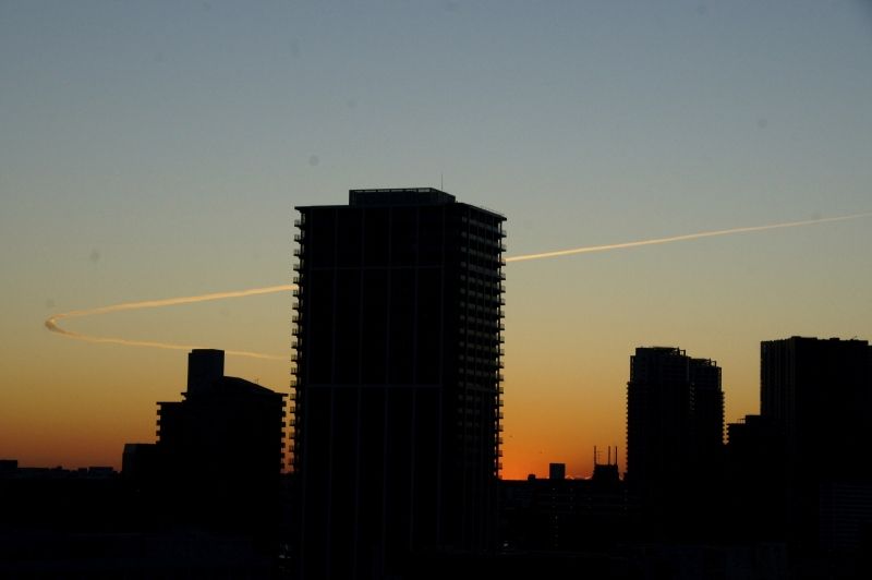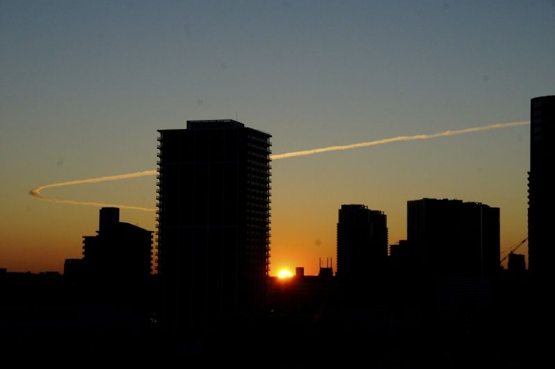 ビルの合間、飛行機雲の間から都会ならではの幻想的な初日の出ですね♪