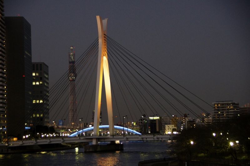 隅田川の上流方面には中央大橋、その先に永代橋。さらにその向こうには東京スカイツリーでっせ!ってね。。