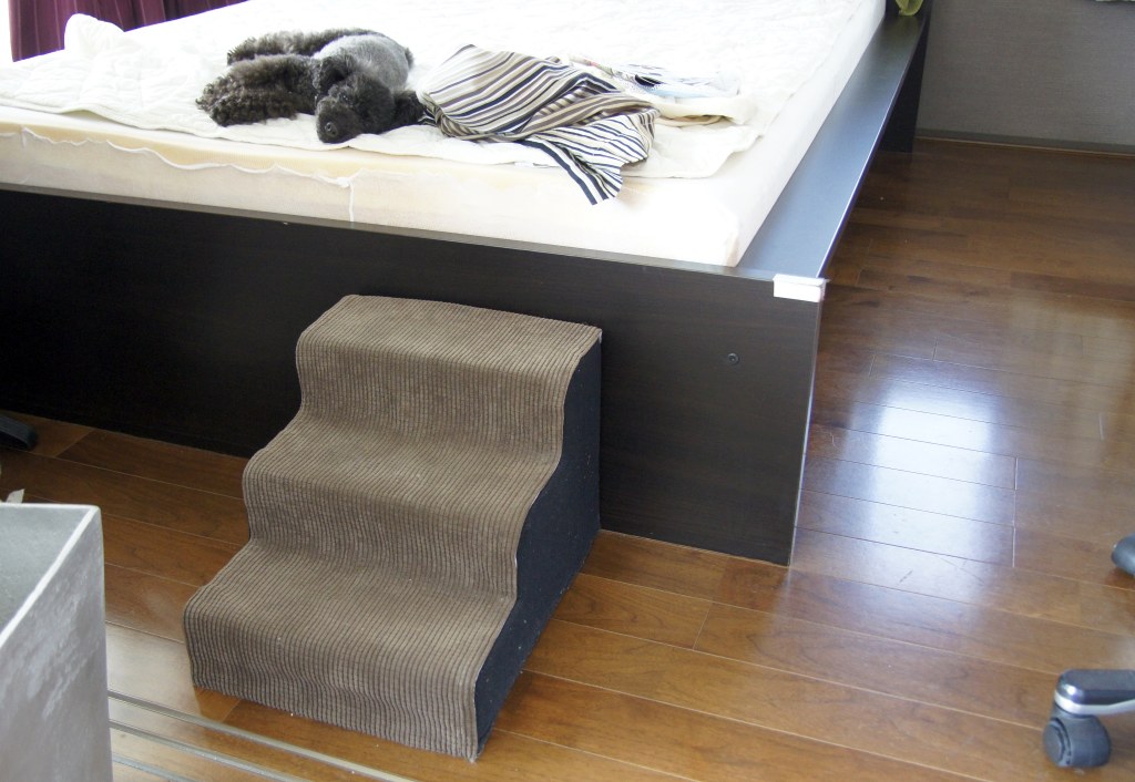 ベッド上部右脇に置いて使用してたリリー用階段を、足下に位置変更しました。