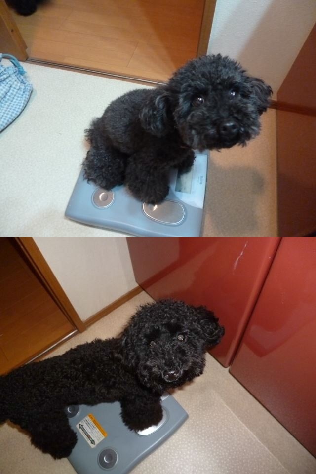 Meguが「体重計るよ~」と乗せたら、きちんとお座りしてじっとしてる。