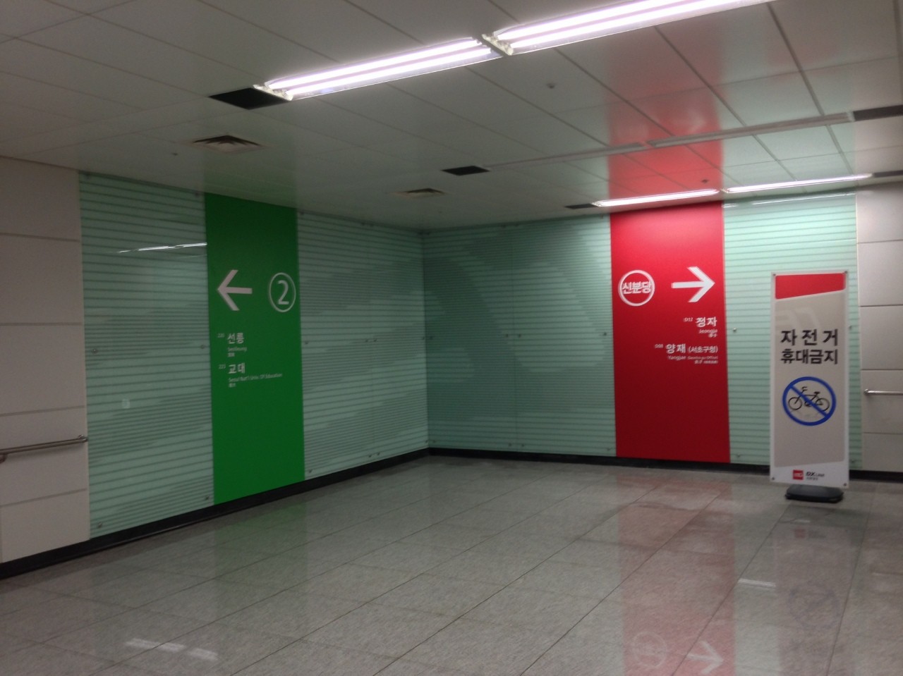 緑の地下鉄乗って、江南から赤い新しい地下鉄に乗りゃ良いんでしょに!