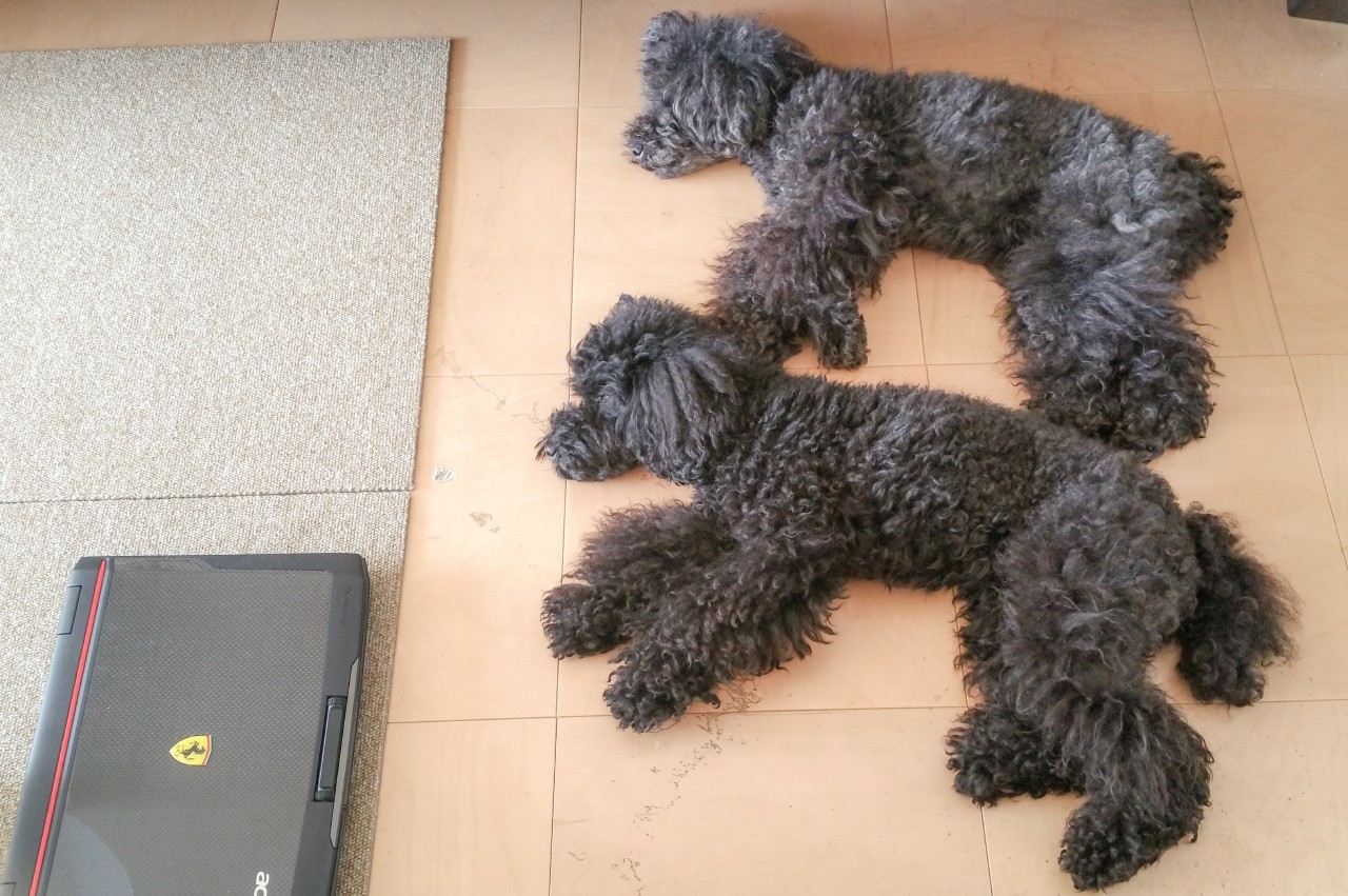 お仕事はりぃ~あっぷぅ~!!なpapaデスクの脇で、お揃いポーズで寝て過ごしてます。。